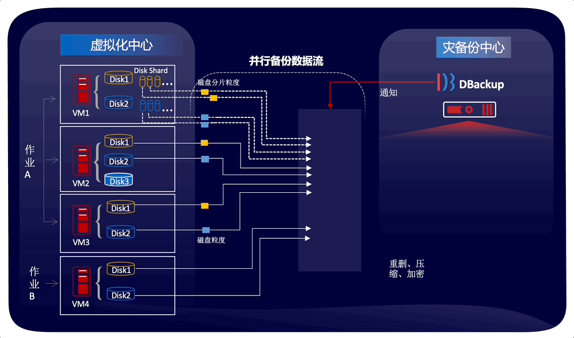 DBackup 新版統一了虛擬化智能并行處理框架,多作業支持多備份主機同時,用戶還可通過宿主機、虛擬機、虛擬磁盤、磁盤分片等多層面合理分配并行備份資源,特別適用于大規模虛擬化場景,有效平衡資源工作負載,提升備份恢復性能。